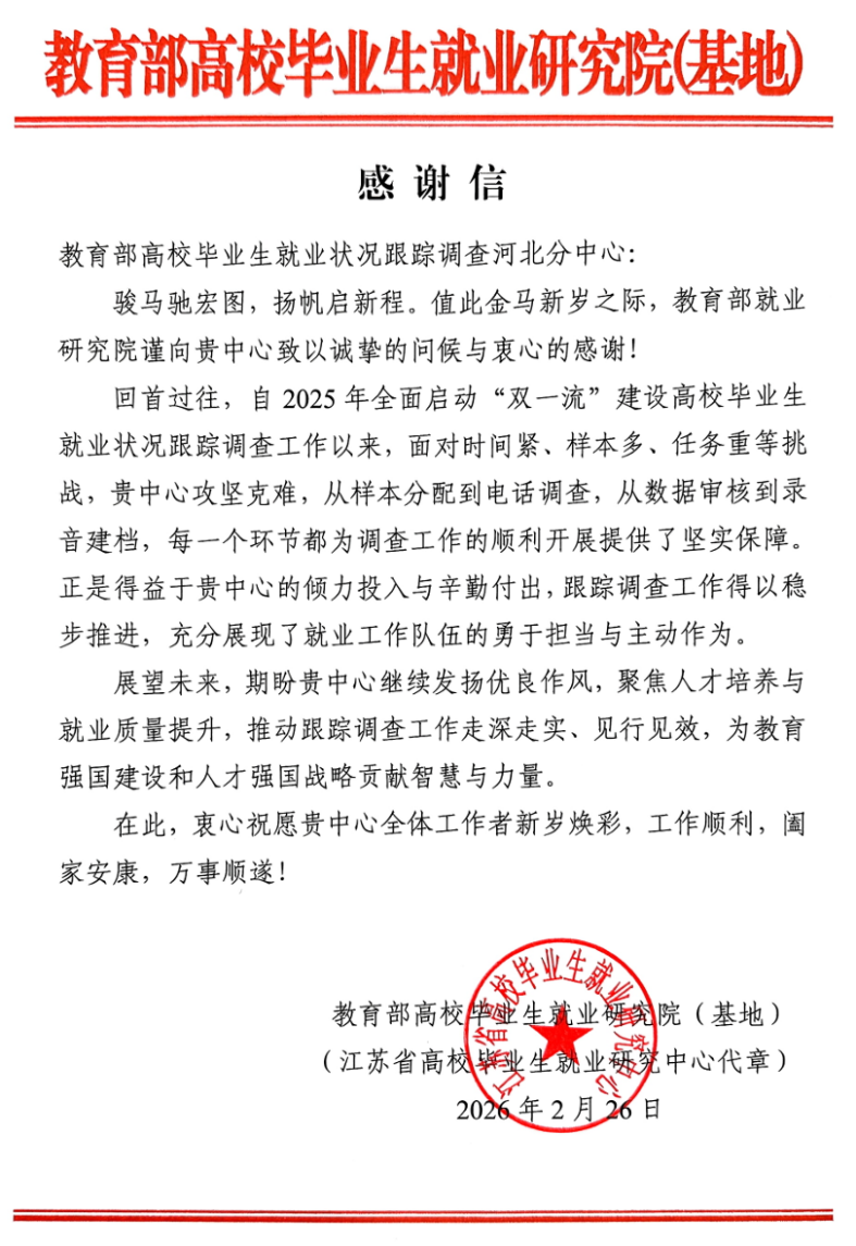 近日,教育部高校毕业生就业研究院向学校发来感谢信,对本校承担的2025年“双一流”高校毕业生就业状况跟踪调查工作给予了充分肯定。感谢信特别指出,面对时间紧迫、任务繁重等挑战,教育部高校毕业生就业状况跟踪调查河北分中心积极应对、攻坚克难,保障了调查工作的稳步推进,充分展现了就业工作队伍勇于担当、主动作为的精神风貌。