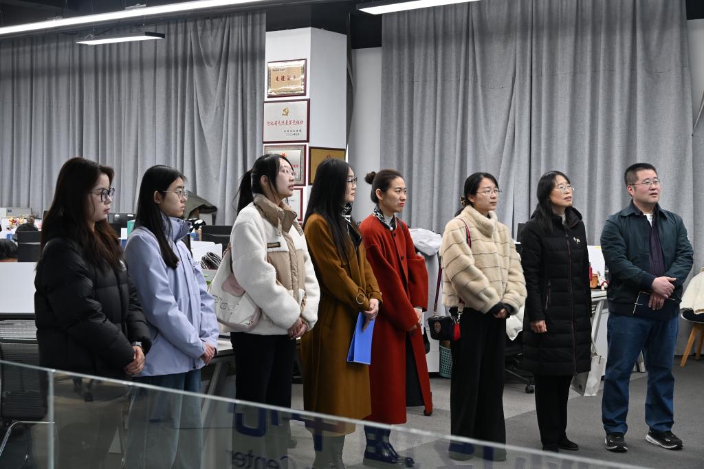 学院师生一行在长城智媒研究院相关负责人的陪同下参观企业,深入了解“学习强国”学习平台的发展历程、建设成果与运营理念,深切体会到平台在思想引领、知识传播、服务群众方面的重要作用。随后,师生们走进XR演播室、访谈演播室,详细了解融媒体节目制作的技术应用、流程规范与创新模式,近距离感受智媒时代媒体行业的发展趋势,为后续校企深度合作筑牢基础。